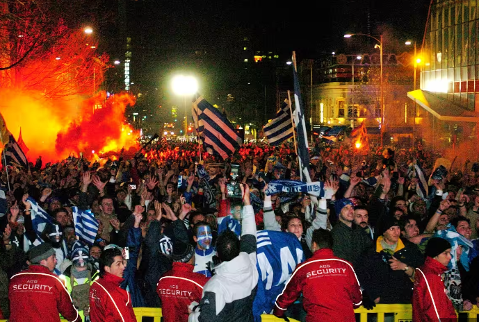 It happened in Melbourne during the early hours of the morning. While most people lay asleep and dreaming in the suburbs, the city was awake with an unfamiliar football passion. As a result of Greece’s unexpected progression in the 2004 Euro Cup Tournament, a massive demand from fans had forced the Government to hastily arrange Live Sites on Lonsdale Street for the Greeks and at Federation Square for the Portuguese to screen the final game. Over twenty thousand people gathered at these screenings, turning Melbourne’s streets into a sea of blue and white, rising and crashing with each wave of play from the match. When the final whistle blew and Greece miraculously claimed the title, the commitment of the masses was rewarded with a dizzying shared euphoria that disrupted the city’s nocturnal silence and carried on long into the morning. As professionals in suits trickled into their city, they were confounded by the remaining clusters of celebrating Greeks who remained on the streets, lighting flares and chanting. The city had woken up, but the football fans were still living a dream.