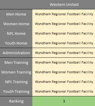In terms of match day facilities Western United have generally played all Youth, Women’s and minor games at the Caroline Springs George Cross’ training facility in Melbourne’s north west. The ALM team however have played at many home grounds.